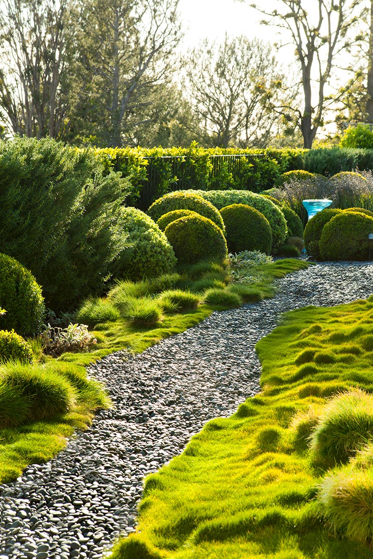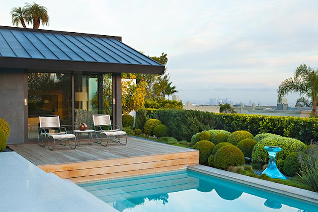 Este rancho na Califórnia está localizado numa encosta inclinada, com quatro jardins distintos ligados pela casa de três níveis no centro da propriedade. O nível principal serve como área social, a sala de estar com portas de vidro deslizantes de ambos os lados, está ligada aos terraços superiores e inferiores.