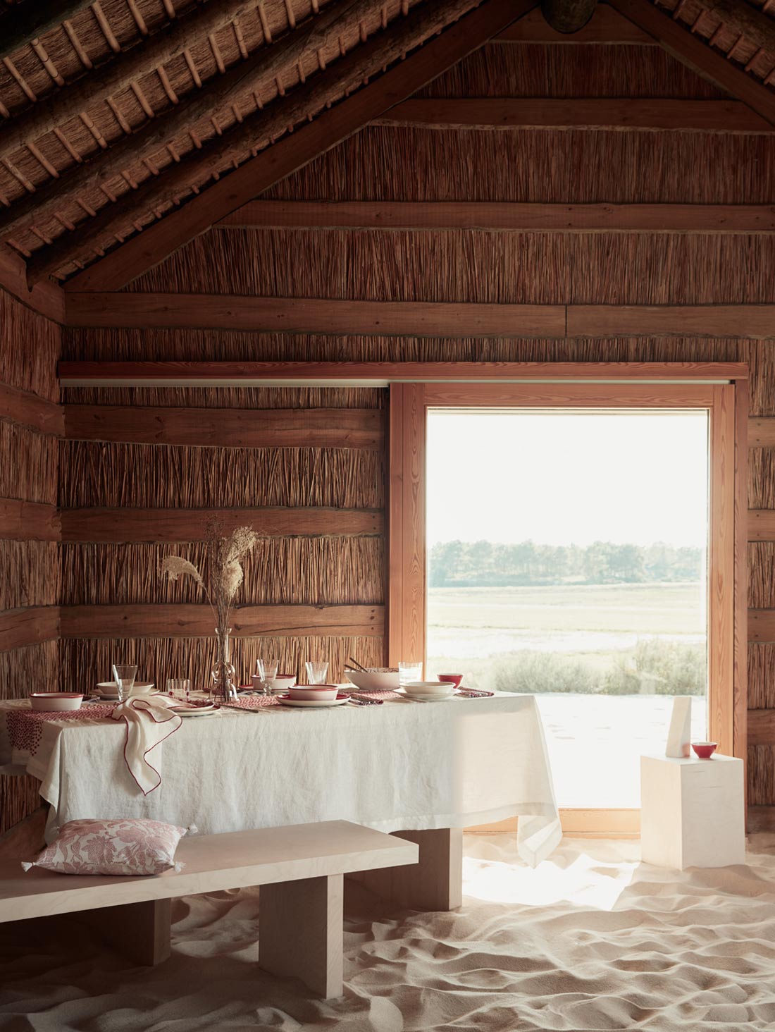 InspiradA numa aldeia escandinava costeira, a paleta de cores e materiais naturais, incluindo persianas de madeira e bronze, compõem a base do projeto.