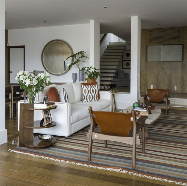 Na decoração, uma tons neutros revestem os sofás, enquanto os tons terrosos aparecem em detalhes, tecidos e tapetes. A caixilharia preta e o uso da madeira freijó são destaques no projeto, que aposta na riqueza de texturas sem pesar no resultado.
