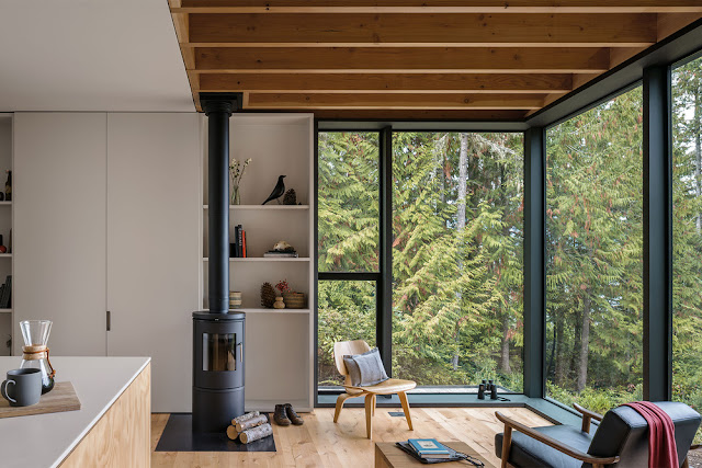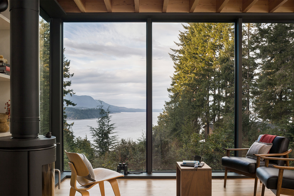 Como se fosse uma casa na árvore, 'Little House' está cercada pela floresta de pinheiros. Com vista para o mar, a cabana está localizada em um dos lugares mais bonitos da costa nordeste de Seattle.