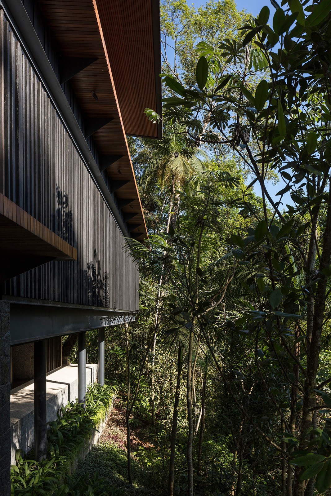Os poucos materiais de acabamento, como madeira carbonizada nas fachadas, granito no piso e madeira natural nos revestimentos foram escolhidos devido à baixa manutenção.