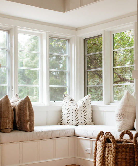 A decoração conta com madeira, fibras naturais, uma paleta que vai do bege ao ocre, móveis brancos e detalhes costeiros.