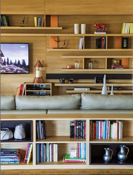 A arquiteta manteve o piso de madeira original da sala de estar e criou uma mistura poderosa de texturas.