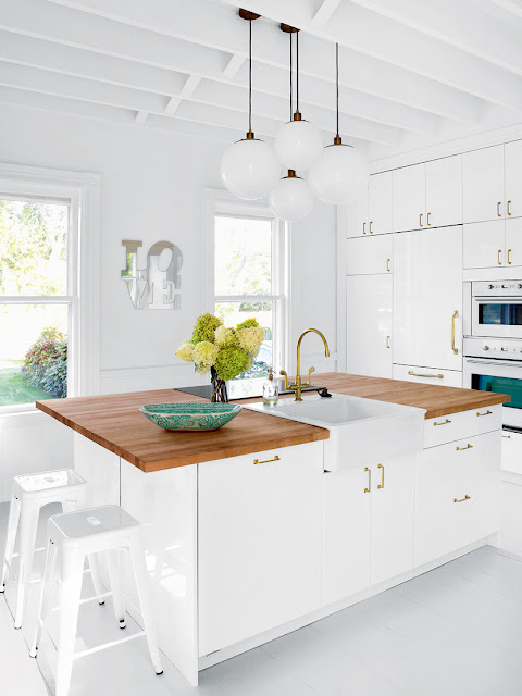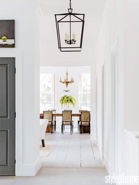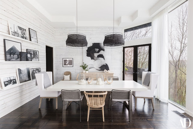 As paredes foram pintadas de branco, assim como o piso, e a mobília é uma mistura fina dos estilos contemporâneo, tradicional, country e urbano, com toques costeiros.