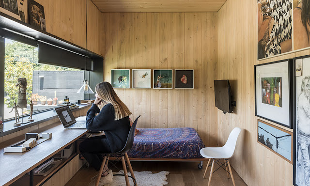 Em Santiago, esta casa com clima de casa de férias, foi construída em madeira e concreto, e conta com espaços integrados repletos de obras de arte distribuídas pelas paredes.