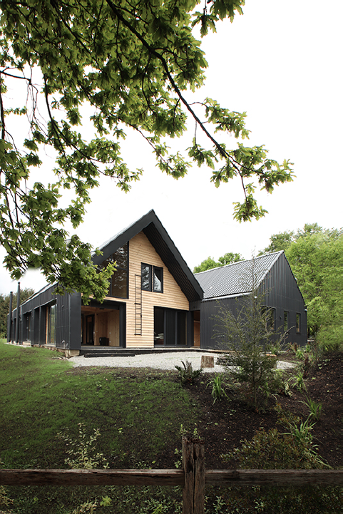 Com estrutura e revestimento de madeira, esta casa está inserida na paisagem do lago Calafquén, com uma leitura moderna do galpão convencional.