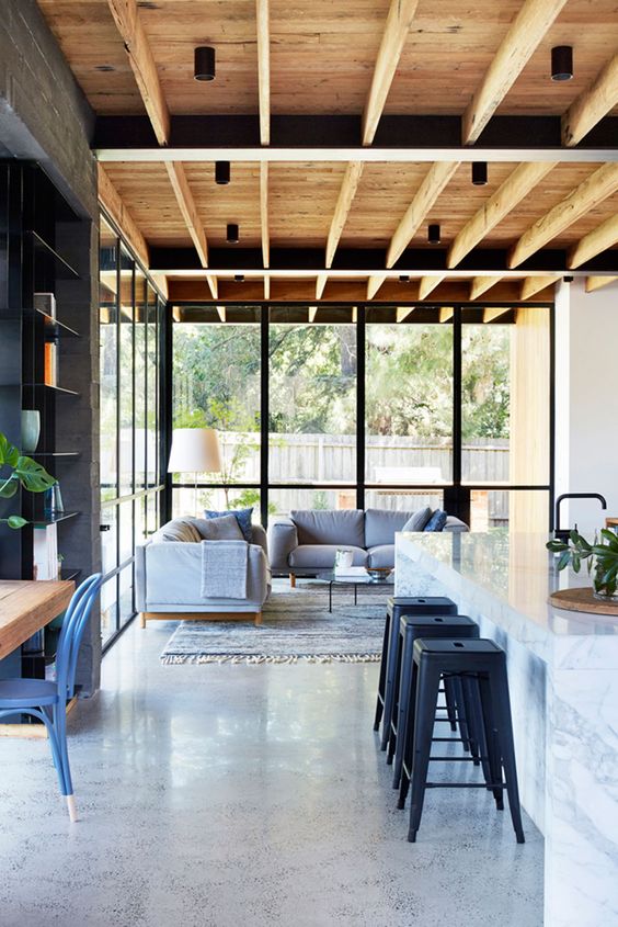 As vigas de concreto e de ferro, quando aparentes, ficam perfeitas se o que se quer é um clima industrial, como visto nos lofts, ou para um resultado super moderno, quebrando a frieza do minimalismo na decoração.