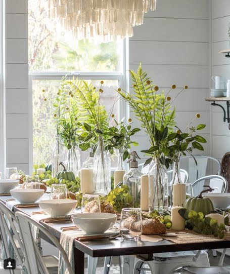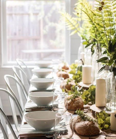 Esta mesa do Instagram Receber com Charme ficou perfeita com flores do jardim em garrafinhas, velas sobre fatias de troncos e um raminho de alecrim em cada pãozinho.