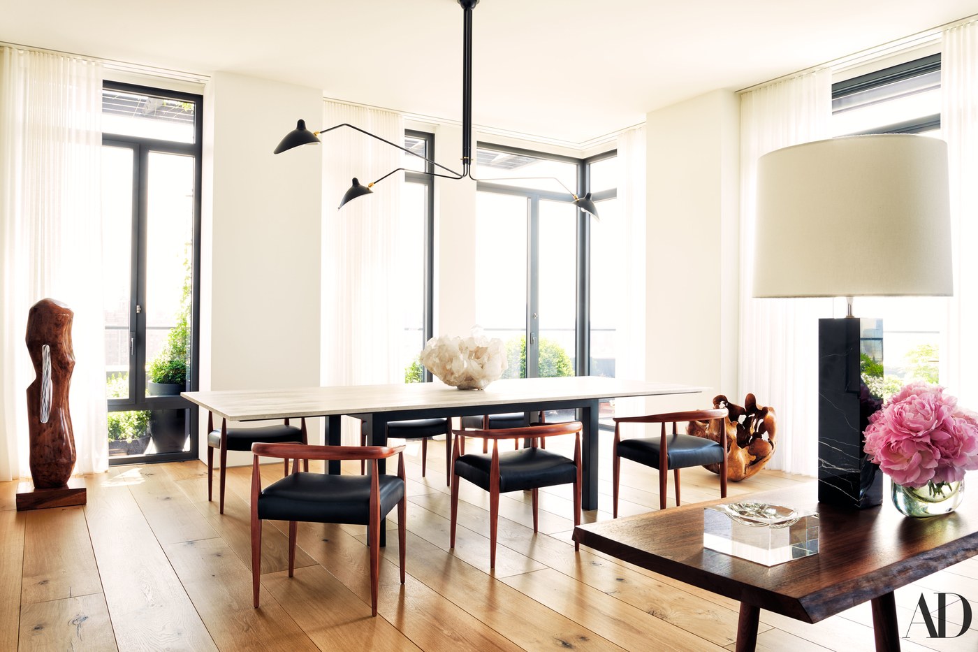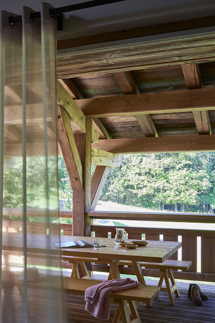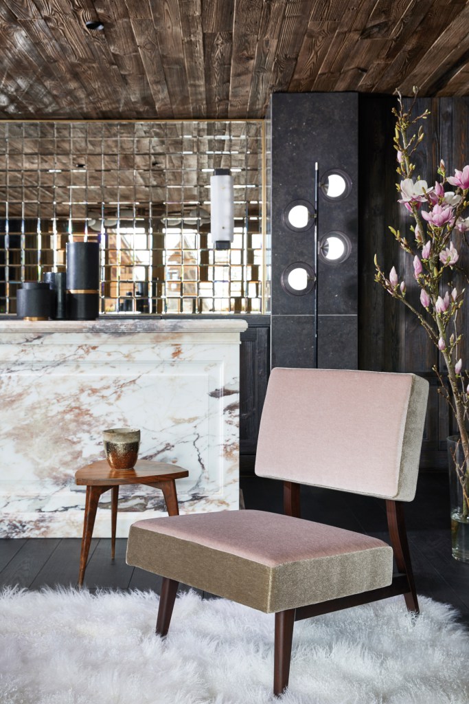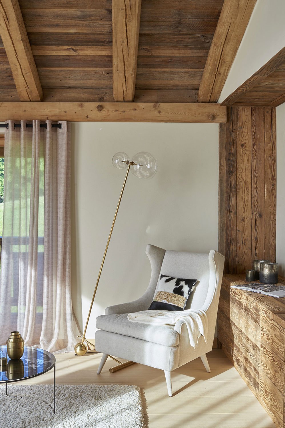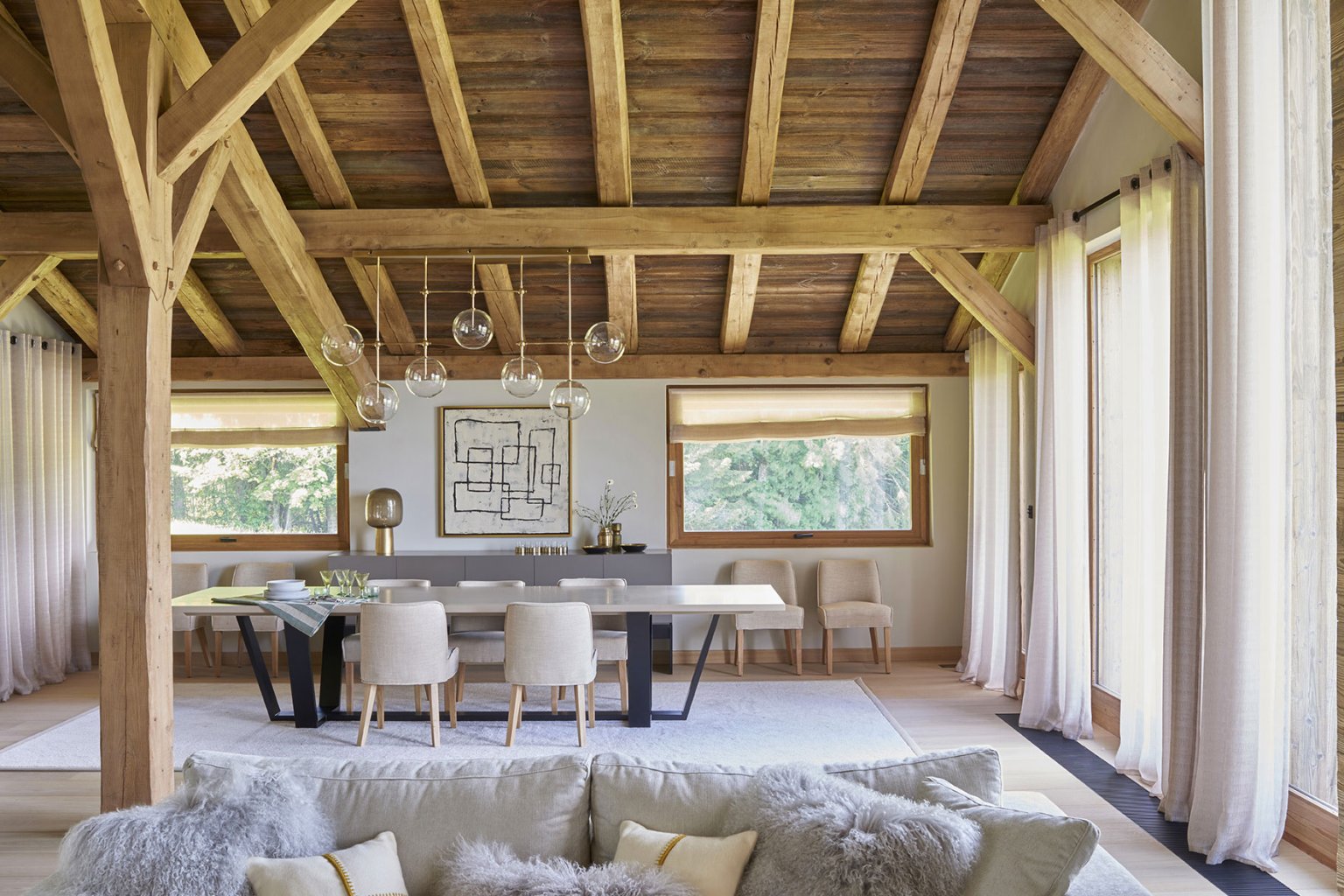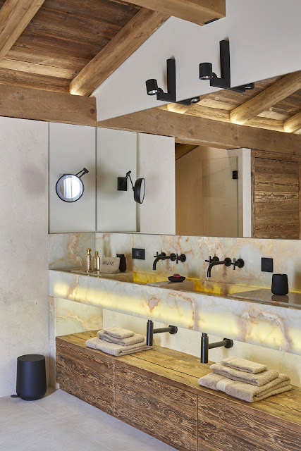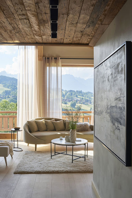 Este chalé de 600 metros quadrados recebeu decoração contemporânea e atemporal, conduzida pelo estúdio Humbert & Poyet. Uma mistura de materiais finamente selecionados respeita a identidade da arquitetura e dos ambientes, como madeiras antigas e materiais nobres, para chegar ao que os arquitetos chamam de "contraste gráfico".