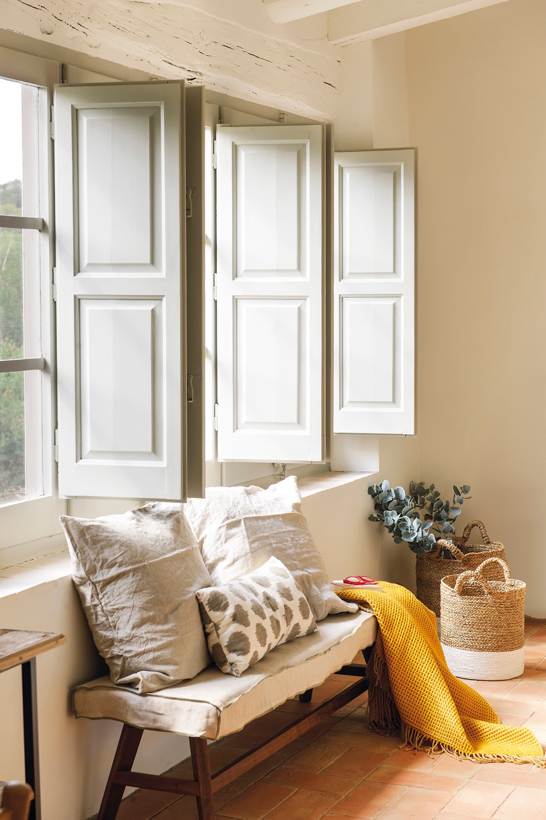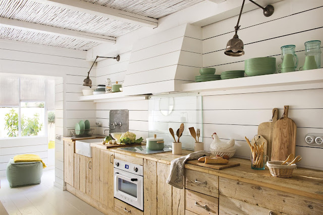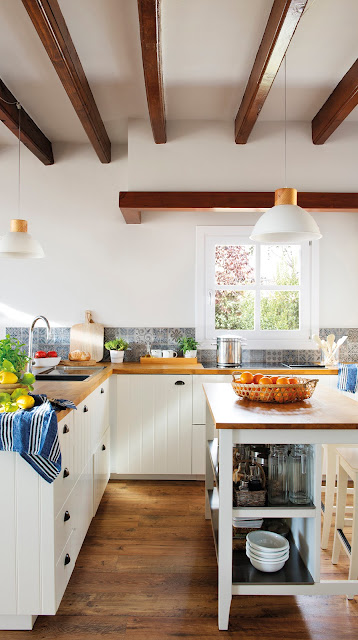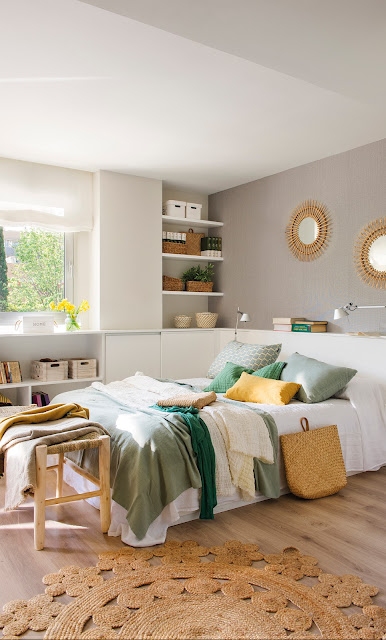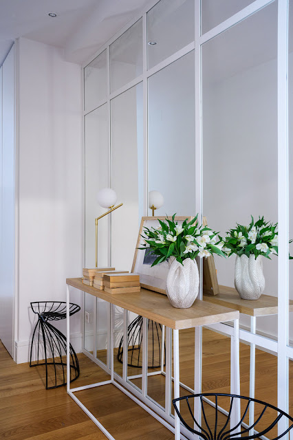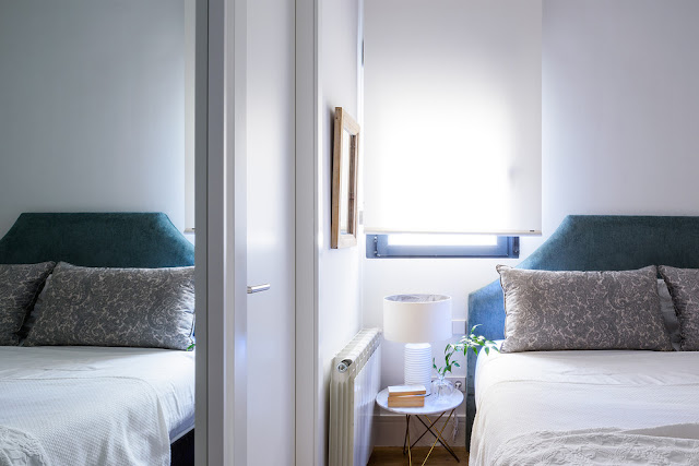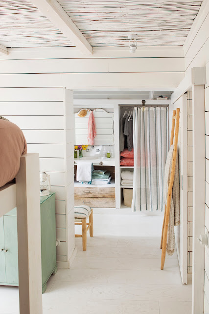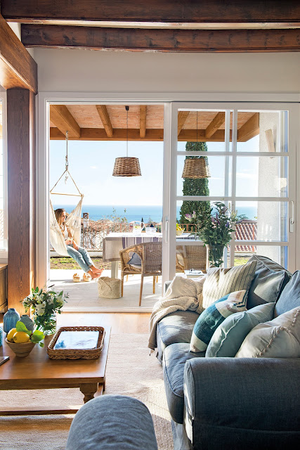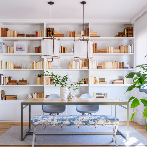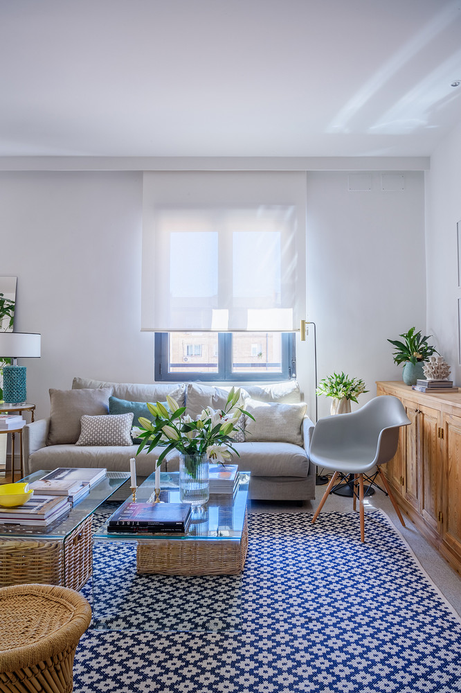 A casa localizada em Madri foi projetada pelo estúdio María Santos, decorada basicamente em branco e azul, madeira e fibras naturais.