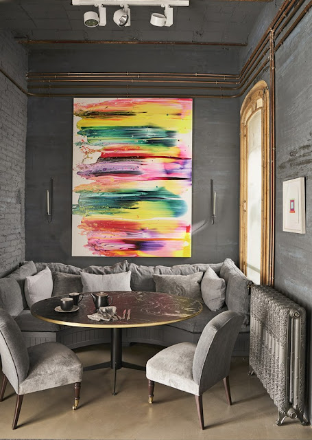 Aqui as cores vivas mudam para cinzas escuros, azuis e neutros. Eclética e atemporal, luxuosa, confortável, industrial e cheia de estilo, o responsável pelo projeto é o designer de interiores de Barcelona, Jaime Beriestain.
