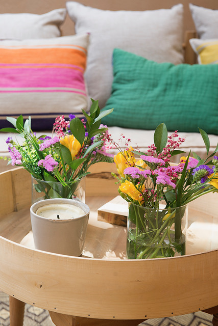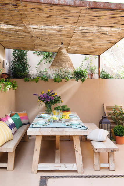 Gabriela Conde foi quem decorou esta casa. Comprou parte da mobília externa no Marrocos e a pintou na cor camelo. O piso, que simula o microcimento, foi pintado com tinta epóxi especial para pisos.