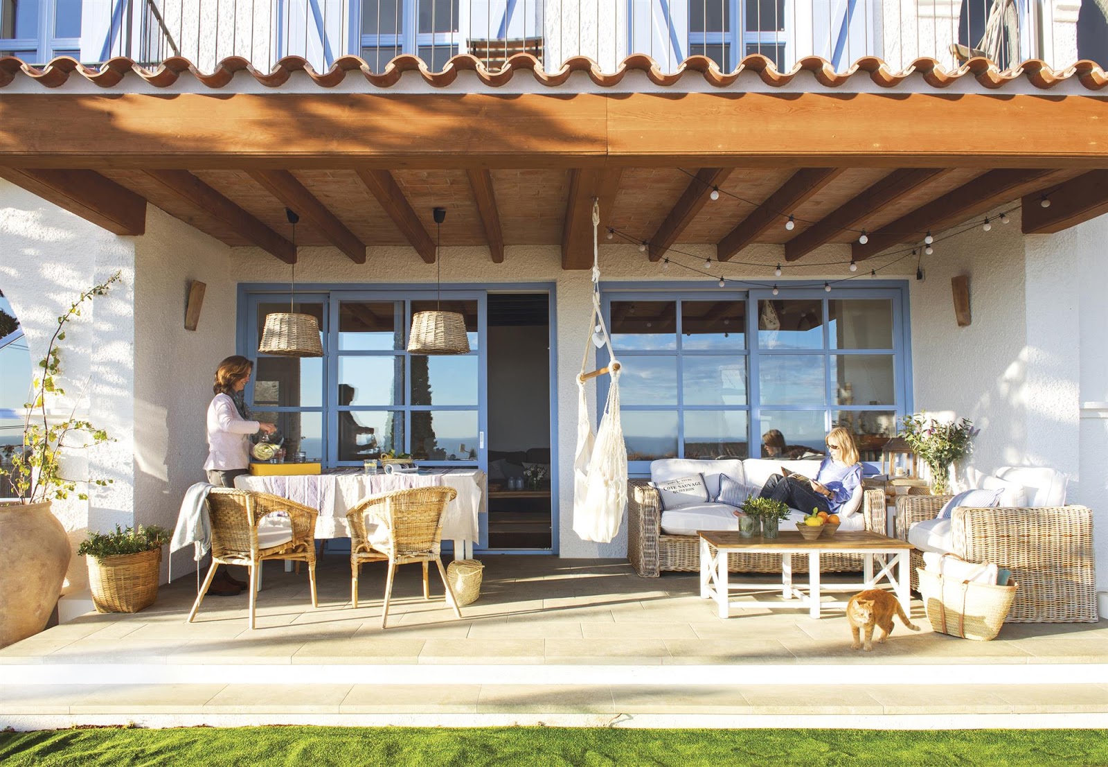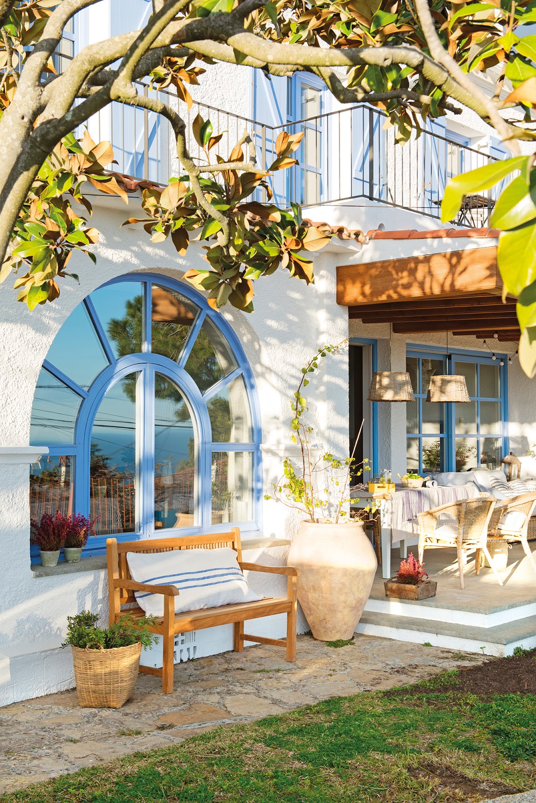 As janelas foram pintadas de azul, que lembra o azul das casas gregas, e a decoração é uma mistura de rústico e casual, visando o conforto e o relaxamento.