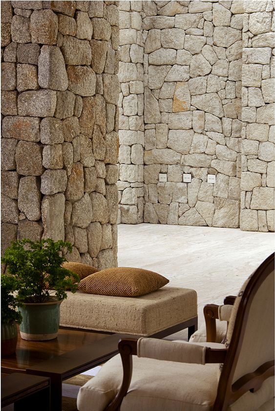 Paredes revestidas com pedra, sejam internas ou externas, funcionam tanto esteticamente quanto como isolantes térmicos e acústicos.