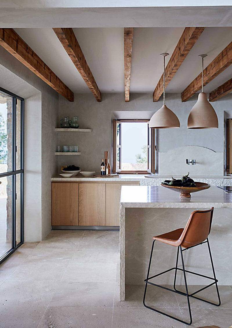 O estúdio More Design projetou esta casa em Maiorca combinando arquitetura tradicional da região com a mistura do estilo natural com o design moderno em ambientes cheios de bossa. Como é proibido fazer alterações significativas nas fachadas das casas da ilha, os designers tiveram que harmonizar a arquitetura rústica com ambientes contemporâneos. Vigas e paredes de teto num cinza/bege natural serviram de base para a decoração minimalista, com peças de design e objetos de arte.