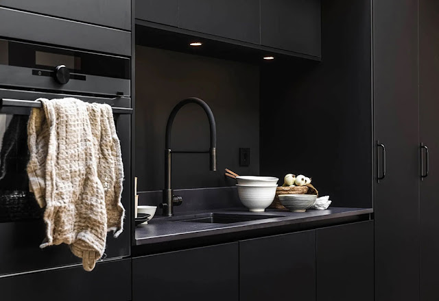 Esta cozinha combina os fazem um lindo contraste com os móveis e paredes pretos.