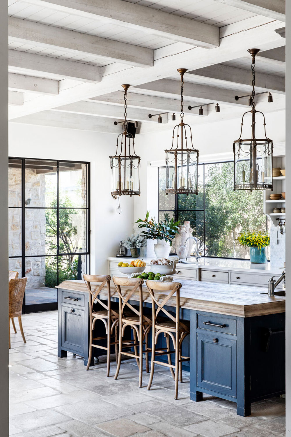 Inspirada nas villas italianas do século XVII, a casa apresenta pisos de terracota e tábuas largas de madeira, vigas rústicas expostas no teto, azulejos italianos do século XVIII, luminárias vintage e paredes de pedra.