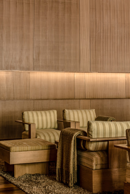 Mobiliada para que a vida ao ar livre seja tão confortável quanto dentro de casa, os ambientes contam com sofás, poltronas fundas, lanternas e tapetes trançados. Para onde quer que você olhe, tanto para dentro quanto para fora, percebe o cuidado com os materiais escolhidos, desde as vigas até os tetos, os pisos de cimento cinza-elefante polido até as peles espalhadas por eles.  Por todo canto percebe-se uma obsessão pela natureza, pelas suas texturas e padrões.