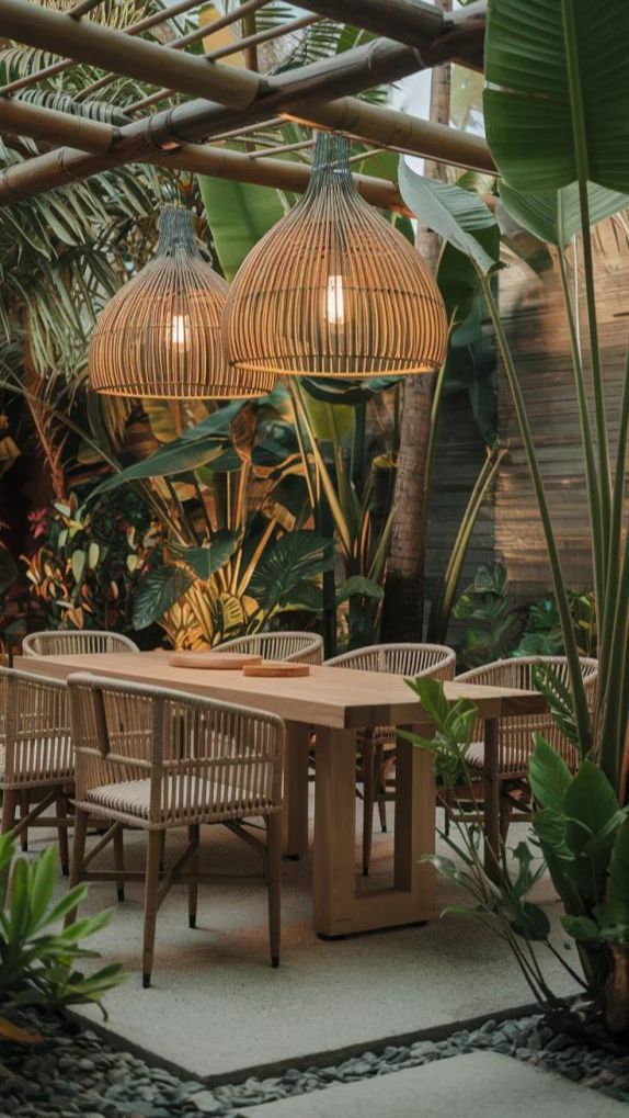 Para criar um ambiente confortável ao ar livre, invista em móveis resistentes às intempéries e adicione um ponto focal, como uma lareira, fogo de chão, uma piscina ou um espelho d'água, para ancorar o espaço. Acrescente móveis com uma pegada natural e complemente o clima com iluminação bem pensada. Para maior conforto, inclua almofadas e considere soluções de sombra, como uma pérgola ou ombrelone, para criar uma atmosfera mais convidativa, caso não tenha uma árvore com copa frondosa.