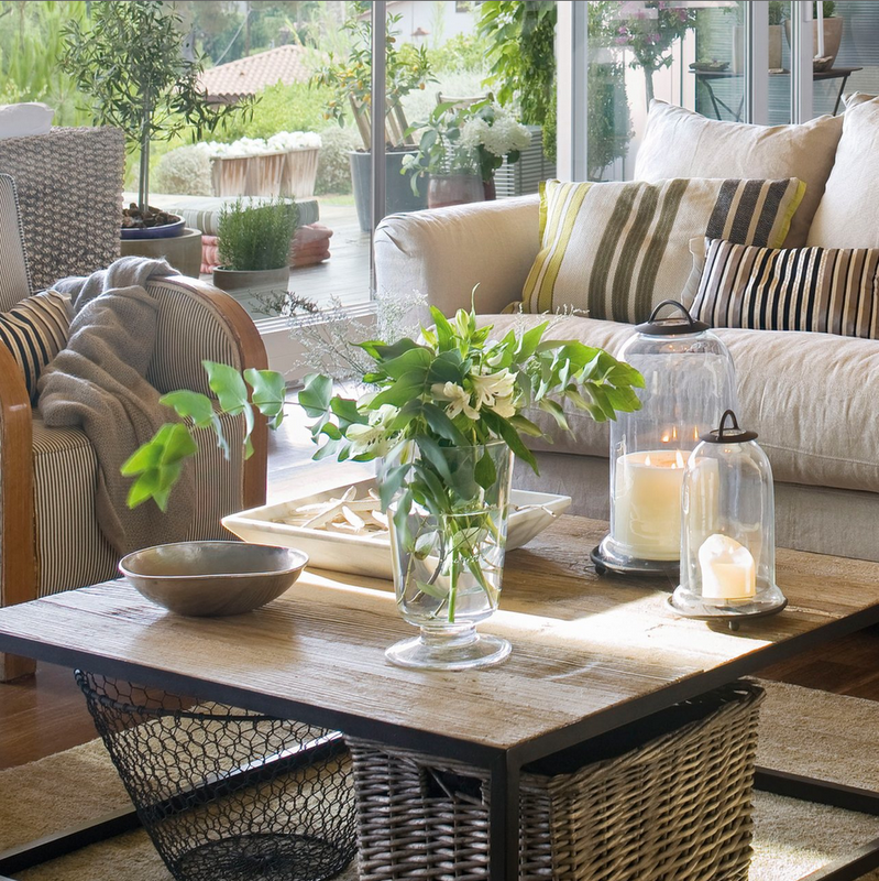 Gosto de mesas de centro com livros, velas, lupas, caixas e ... flores.