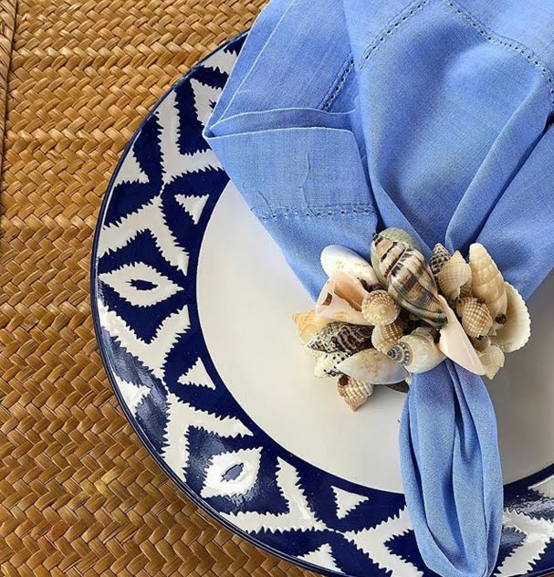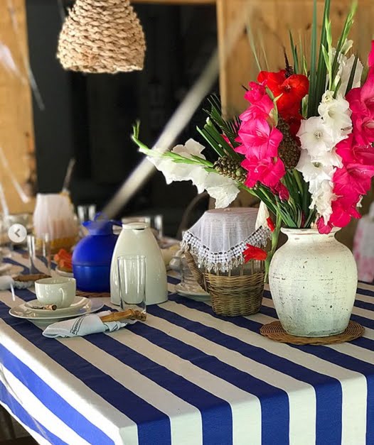 Aqui também, em clima de verão, a mesa rústica com palha, conchas, arranjo de frutas e flores e toques de azul, vai fazer bonito tanto na praia quanto na cidade e no campo.