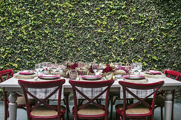 No meio do jardim, com toalhas no xadrez vermelho e branco que eu adoro, decoradas com lindas composições de velas, vasos de temperos, tomates e limões sicilianos é outra sugestão cheia de bossa.