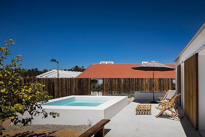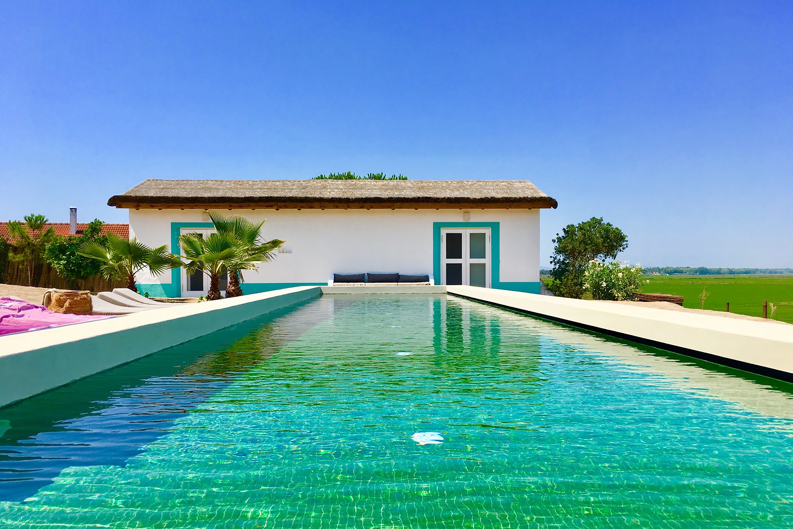 Cercada por pinheiros, com vista para os arrozais, a arquitetura é tradicional do Alentejo: telhado de palha e calcário branco, com detalhes em turquesa, quase a cor do mar.