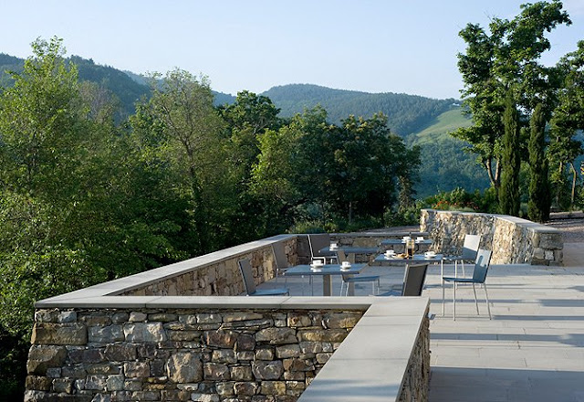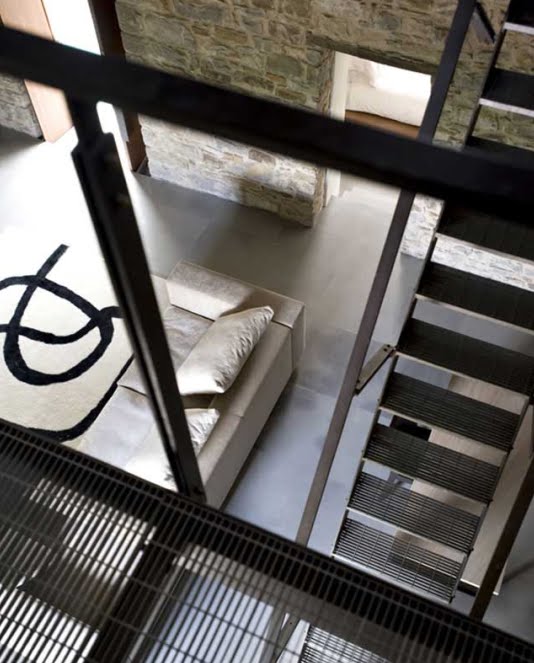 A casa mistura materiais tradicionais como madeira, pedra e concreto polido, e a decoração conta com peças assinadas numa contraposição super charmosa com a arquitetura medieval.