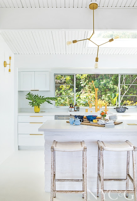 Todos brancos, os espaços ganham vida com o colorido dos acessórios e objetos de arte, dando à casa um clima tropical em Malibu.
