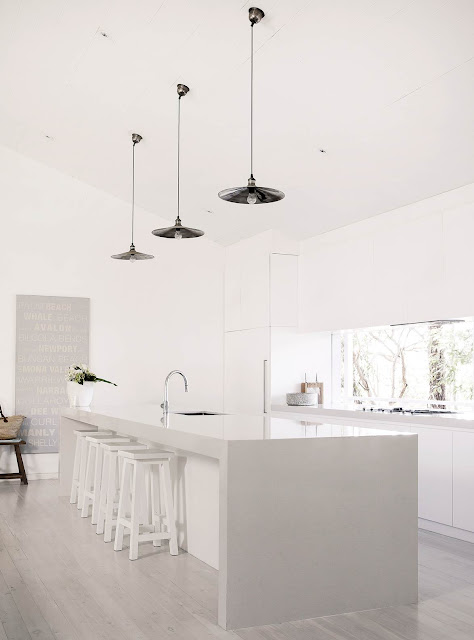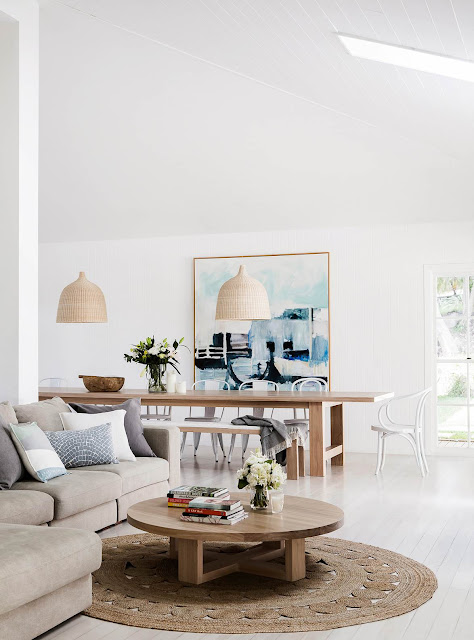 Nesta casa na costa australiana tons inspirados no oceano se misturam com paredes e tetos pintados de branco, compondo com o calor da madeira em ambientes descontraídos com vista para o mar.