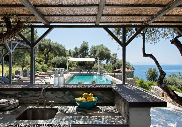 No sopé de uma falésia, perto do mar, a piscina tem uma cozinha de verão sob a sombra de uma pérgola de palha.