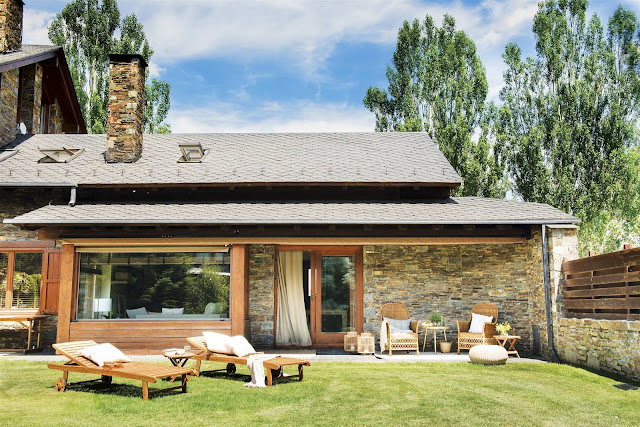 A mistura de texturas como concreto, pedras e tijolos aparentes cria um contraponto interessante com a madeira e a decoração.