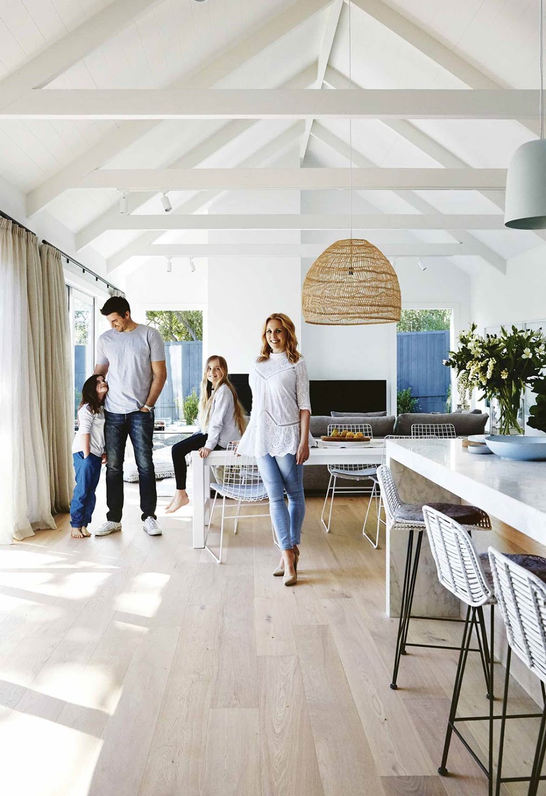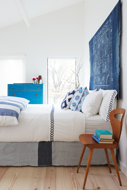 Piso de madeira lavada, paredes brancas, clarabóias que permitem que a luz natural inunde os ambientes, e tapetes e almofadas coloridos deixam a casa alegre e iluminada, sob medida para um casal criativo.