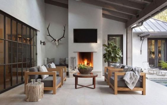 Lareiras nas áreas externas têm um clima de casa de campo pra lá de hospitaleiro.