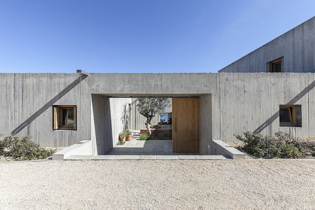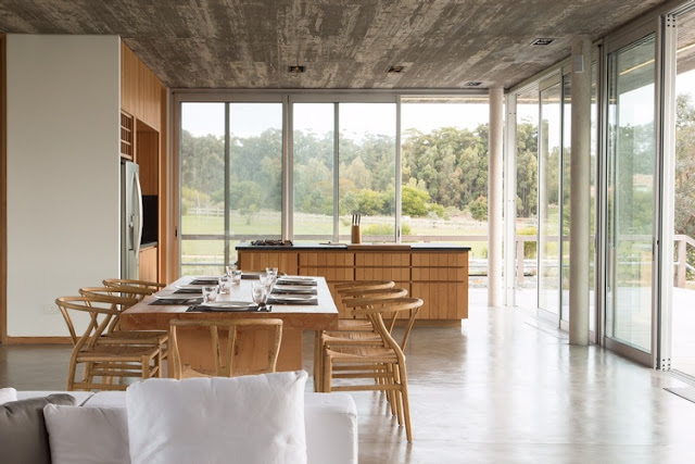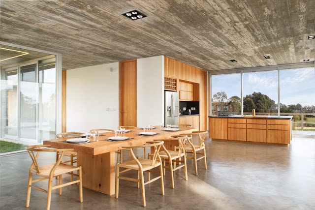 Esta casa no campo uruguaio foi projetada numa sequencia de volumes e pátios que mais parece uma pequena cidade. Concreto, pedra e madeira são a base deste projeto, e a integração dos materiais é perfeita.