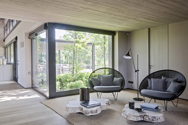 A decoração é basicamente cinza, bem ao estilo escandinavo, sem excessos, para não competir com a vista.
