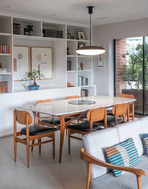 Com um espírito simples, claro e acolhedor, este apartamento chegou ao clima contemporâneo, misturando peças de design moderno a outras que contam a história dos donos.