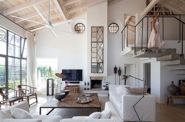 A decoração é uma seleção de tapetes marroquinos, fibras naturais e claro, tecidos.