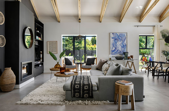 Projetada por Zachit Tshuva, esta casa em Netanya, Israel, foi pensada para desacelerar. A utilização de materiais naturais, madeira de demolição em janelas e soleiras, pisos de pinheiro branqueados e pedras basálticas na área externa conferem à casa um clima atemporal e natural.