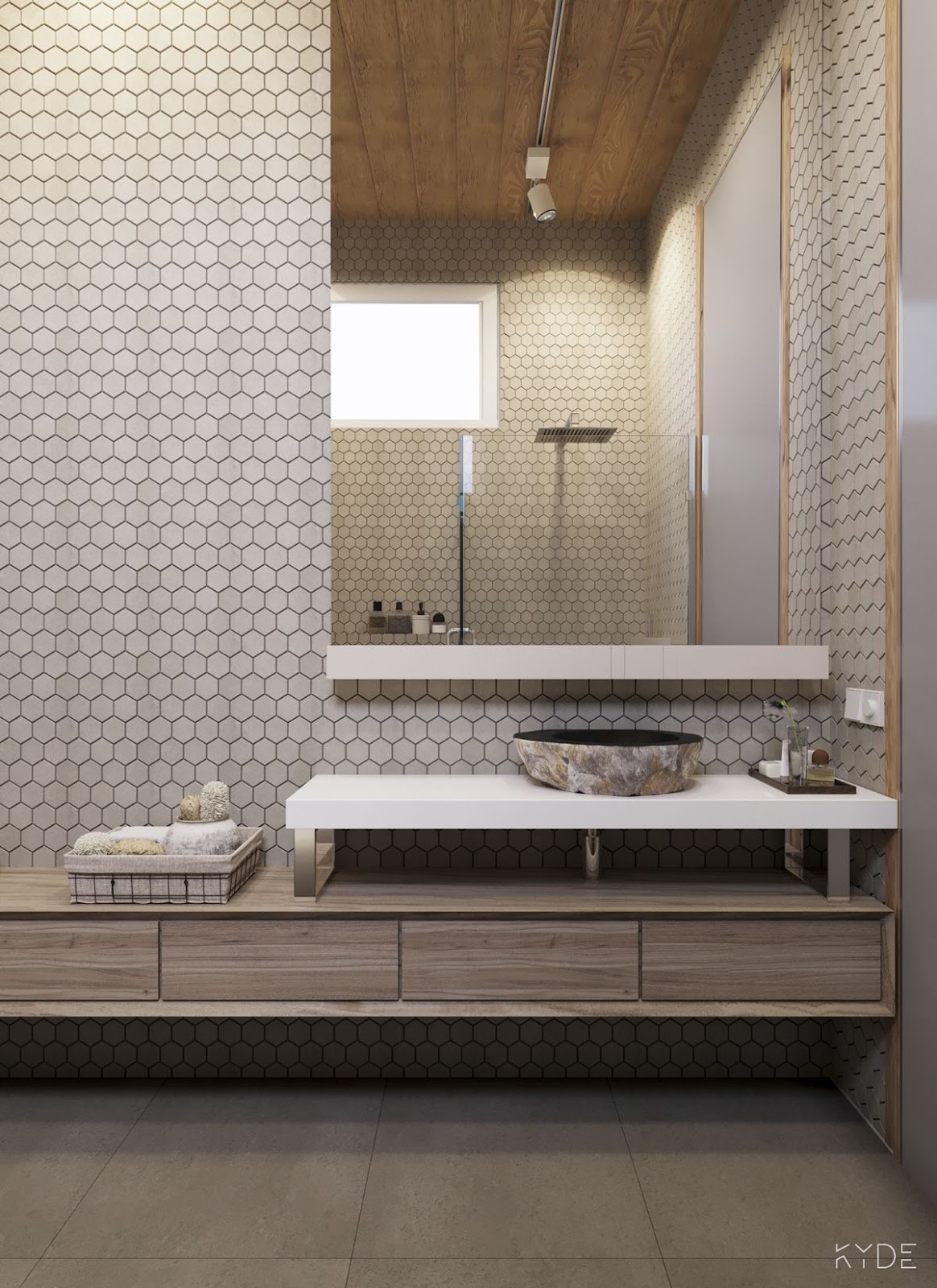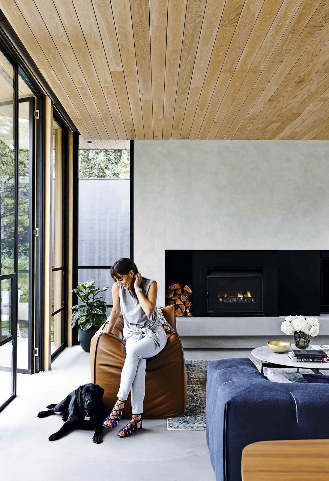 O piso em limestone azul contrasta lindamente com a cor da madeira.