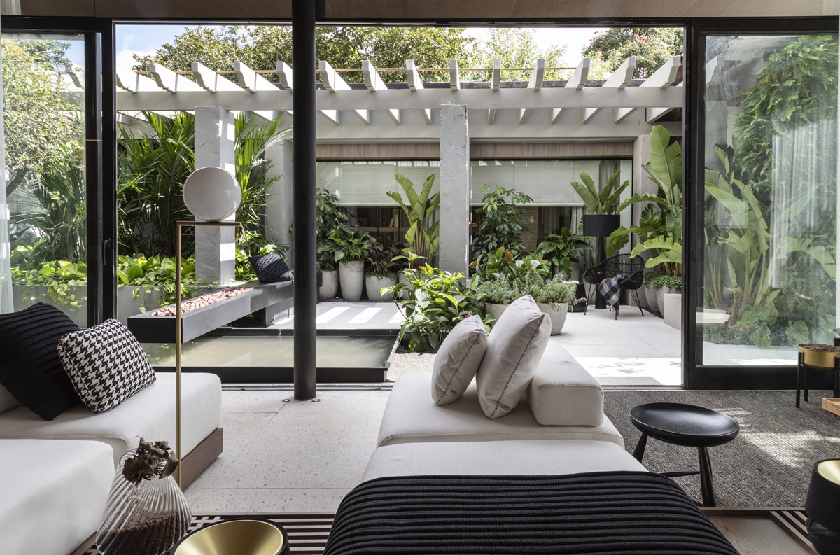 Com o objetivo de criar um espaço integrado à área externa, os arquitetos projetaram grandes janelas de correr para dividir os espaços de estar do jardim privado do apartamento.