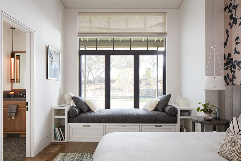 Este rancho na Califórnia conta com ambientes claros e acolhedores, janelas com vista para o vale, sala de estar com lareira e vários cantinhos para sentar e relaxar. A decoração é neutra e confortável, e algumas paredes são revestidas com pedra, o que traz um clima de solidez e naturalidade à casa.
