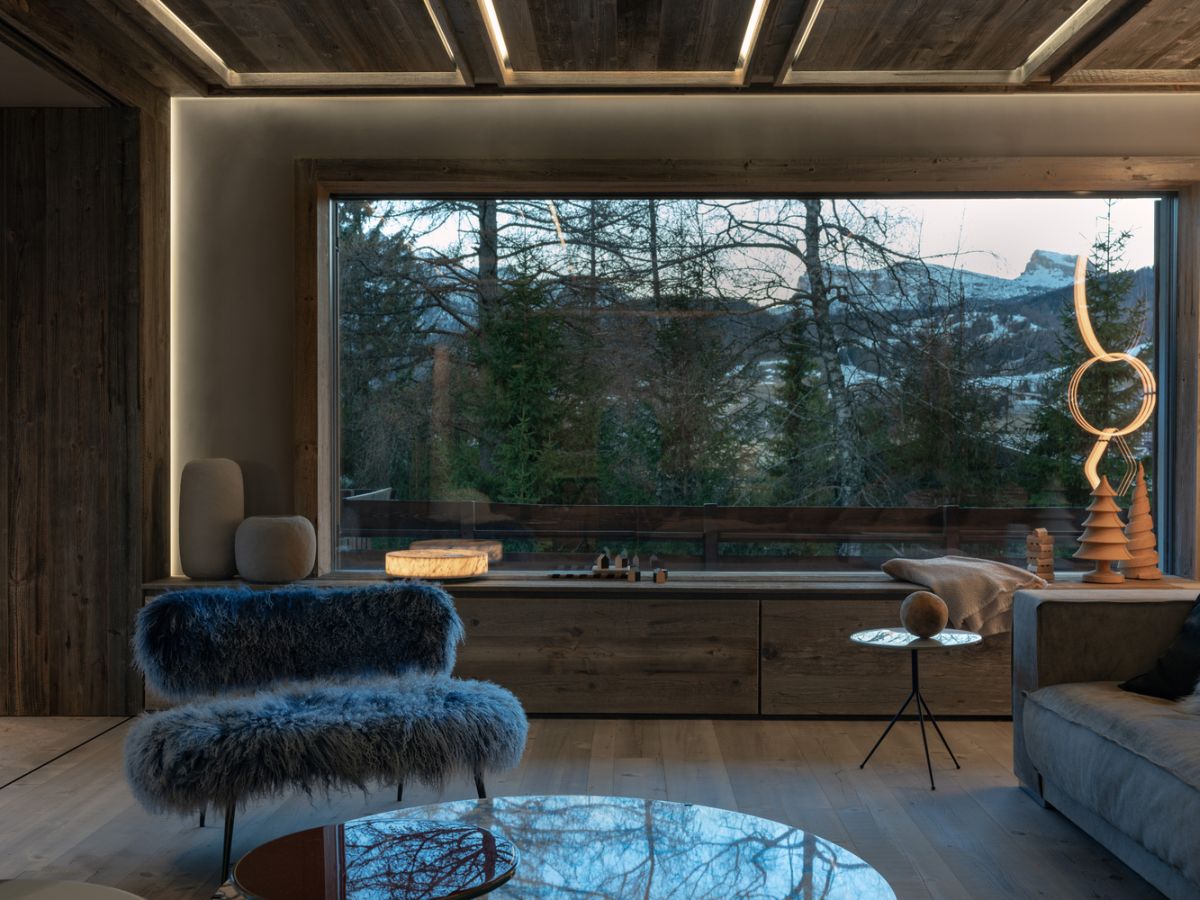A decoração minimalista mistura o estilo das montanhas e o urbano, trazendo as cores da natureza para os ambientes através das enormes janelas.