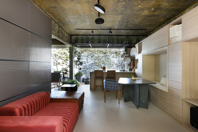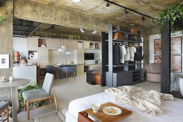 O loft foi dividido em sala de estar, jantar, cozinha gourmet, lavabo, banheiro e quarto com closet, provando que é possível viver bem em poucos metros, mesmo com "espaços divididos, compartilhando seus usos e às vezes, tornando-os misturados, deixando a casa mais fluida e funcional, com divisórias em madeira, que não separam realmente os ambientes”.
