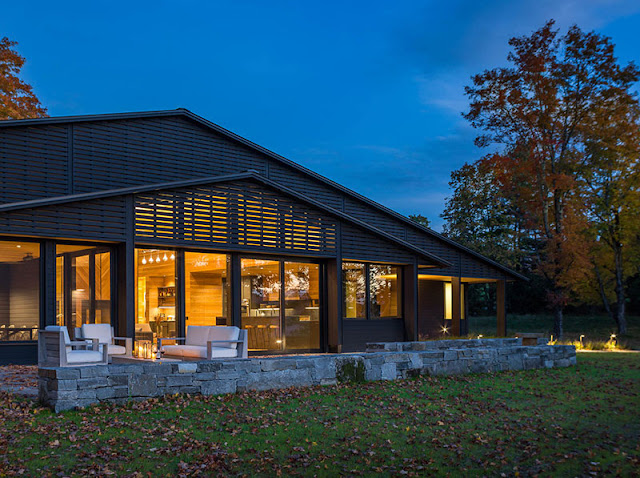 Em formato triangular, a fachada desta casa á beira do lago em Vermont, nos Estados Unidos, aumenta o alcance da vista da montanha em frente. Com acabamentos de madeira e uma lareira, foi possível fazer um zoneamento interessante e separar as salas de jantar e de estar.