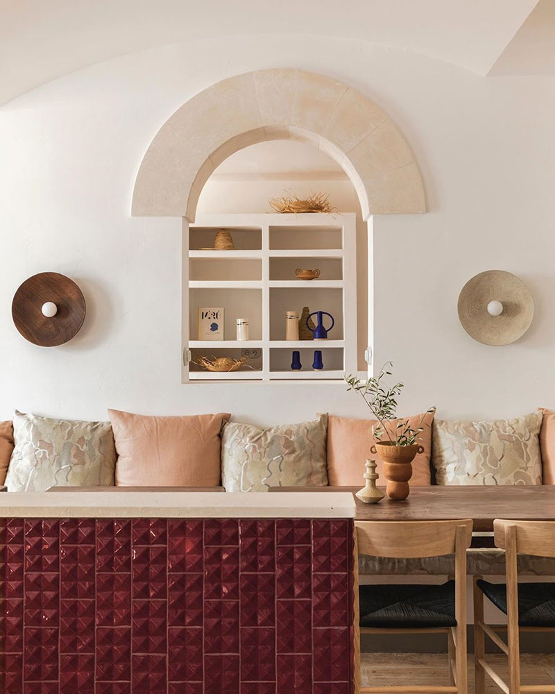 A madeira de oliveira e o couro natural são complementados pelas cores inspiradas no céu de Menorca, que vai dos azuis pálidos e dourados do início da manhã aos tons vibrantes de ferrugem do pôr-do-sol.