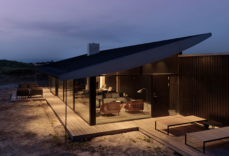 Os escandinavos não são fãs de cortinas ou persianas que criem barreiras à vista, e esta casa na ilha isolada de Fano, na Dinamarca, prova exatamente isso, com seus espaços abertos à natureza graças aos painéis de vidro, e à arquitetura retangular.