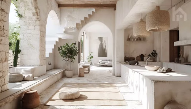 Aqui mais uma vez a cozinha se funde com um pátio interno. A luz natural toma conta do espaço, realçando o ambiente acolhedor criado pelas texturas orgânicas e tons terrosos.