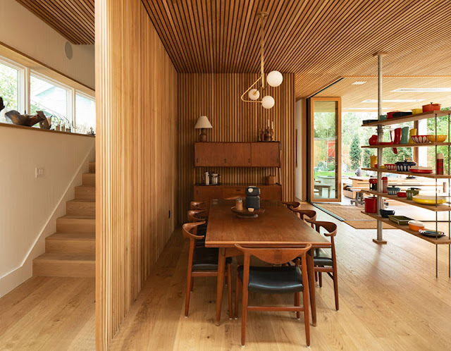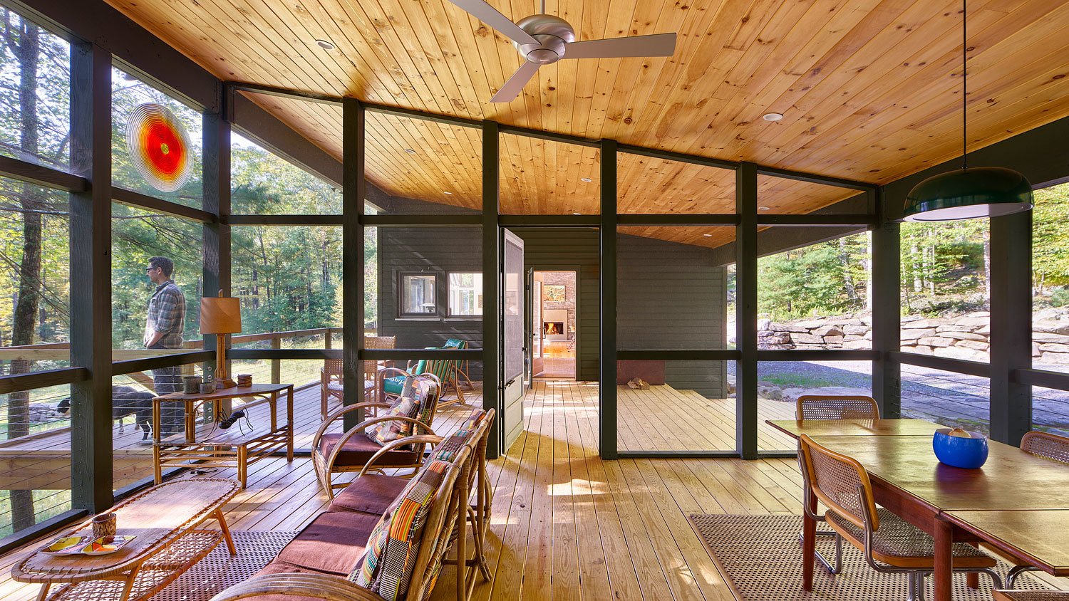 Ao projetar esta casa de férias em Long Lake, a Winkelman Architecture se inspirou no bosque de carvalhos em que foi construída. Um corredor coberto, com vista para o lago, liga a cozinha, salas de estar e de jantar com o quarto.